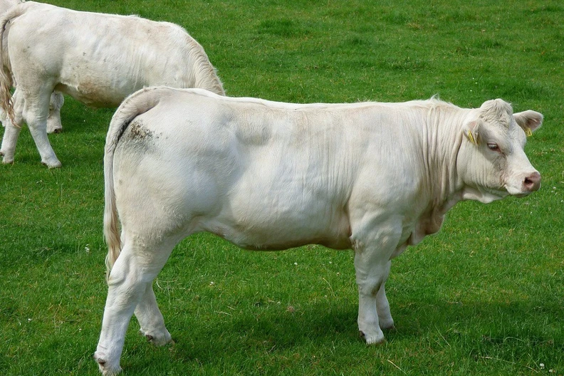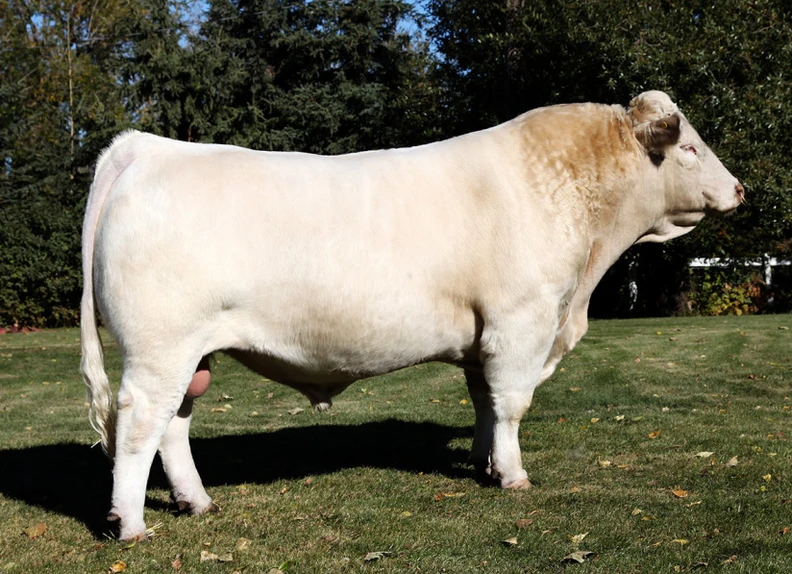 Features are white or cream coat; polled and horned strains. Suited to bullock production or as a terminal sire in crossbreeding programs.